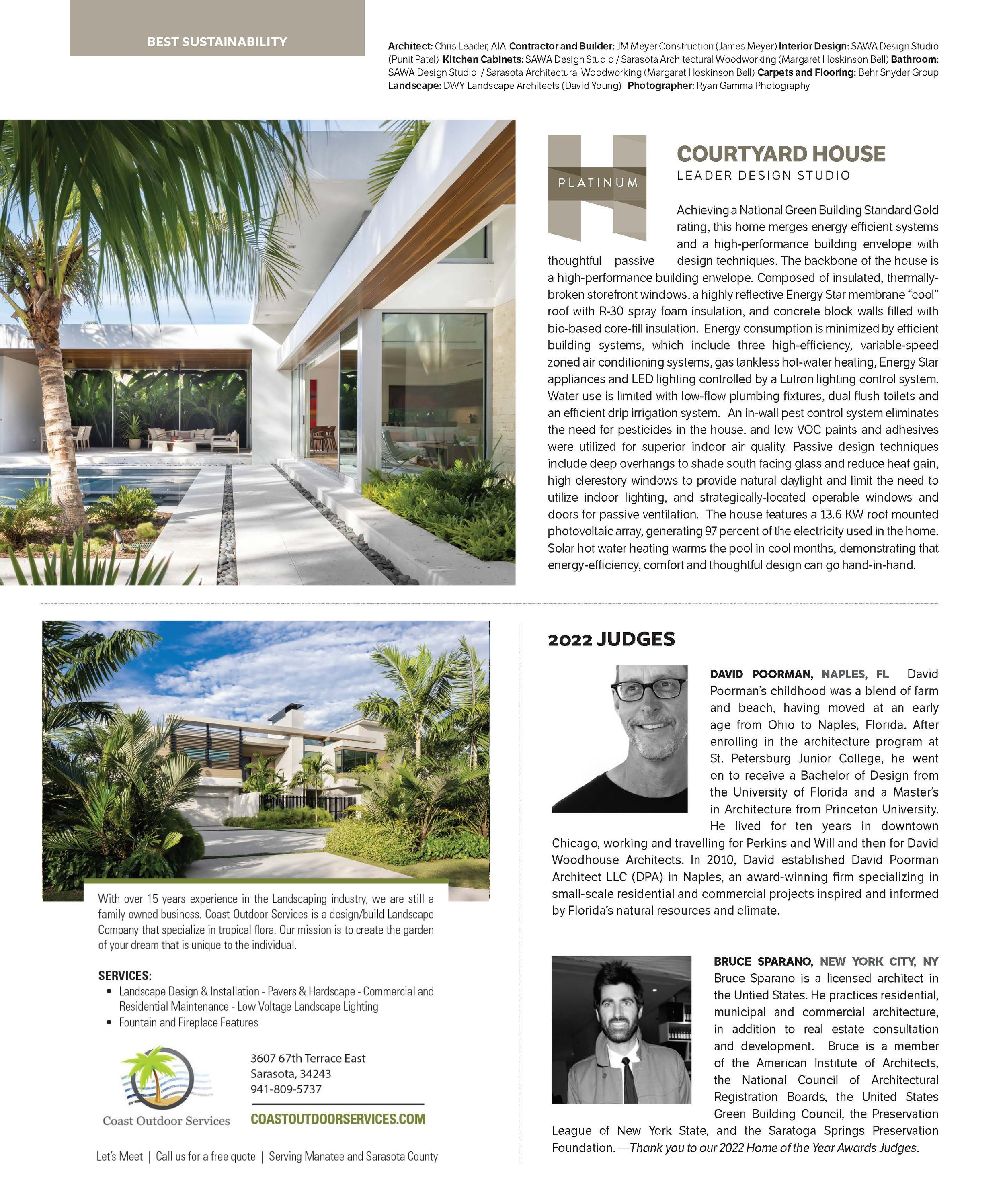 2022 SRQ Home of the Year, " Platinum Award, Sustainability Green ", Courtyard Home